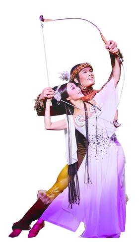 眾所周知,舞劇的一個(gè)突出特點(diǎn)就是演員在臺(tái)上不說(shuō)也不唱,完全依靠形體的表現(xiàn)力來(lái)完成主題思想的闡述、矛盾沖突的展現(xiàn)、人物性格的塑造。該劇藝術(shù)表演指導(dǎo)、嫦娥飾演者、中國(guó)歌劇舞劇院國(guó)家一級(jí)演員山翀深諳此理,她告訴記者,為了準(zhǔn)確刻畫(huà)嫦娥的形象,她翻閱了很多有關(guān)嫦娥奔月傳說(shuō)的史料,反復(fù)研究連環(huán)畫(huà)、小人書(shū),乃至電視劇中嫦娥的形象?!霸谖业睦斫庵?,嫦娥既是仙又是人的這么一個(gè)形象,所以既要在獨(dú)舞或雙人舞的動(dòng)作處理上展現(xiàn)神仙比較飄逸的感覺(jué),又要很自然地融入群舞中進(jìn)行交流,突出人的樸實(shí)的狀態(tài)?!鄙搅堈f(shuō),“關(guān)于嫦娥的傳說(shuō)有很多個(gè)版本,有的說(shuō)嫦娥想過(guò)天上的生活,于是就去求玉帝要來(lái)仙藥,讓她和后羿都到天上去,但我在劇中所要表現(xiàn)的嫦娥是為了不讓河伯吃了仙藥去禍害人民,才忍痛與后羿分離吃下仙藥的,因?yàn)橹袊?guó)人心目中的嫦娥一直是一個(gè)美好的形象,所以要盡可能地把嫦娥的美麗,對(duì)愛(ài)情的忠貞和對(duì)老百姓的熱愛(ài)表現(xiàn)出來(lái)?!?/p>
