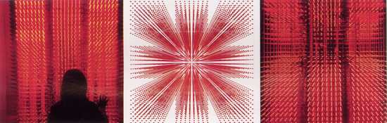 本次中國館展覽的海報上,一個閃耀著光芒的紅色光塔,來自燈光設計師許東亮的互動燈光裝置。在與策展人討論的過程中,許東亮決定用LED光來完成作品,于是就使用了3萬多個LED光點組成光塔,觀眾走近就亮些,觀眾離開就黯淡了。在方振寧看來,這座塔象征火的發(fā)現(xiàn)和光的發(fā)明,映襯著人類賴以生存的篝火和星空。