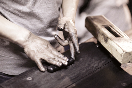 杵搗:所有的制墨原料和膠以后,要竭力攪拌均勻,然后杵搗。古時(shí)制墨以青石作臼,檀木作杵,搗時(shí)如干燥粘杵,可反復(fù)灑少許中藥汁,直至搗勻搗透才能出臼。故有墨不厭搗之說(shuō)。