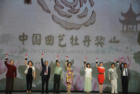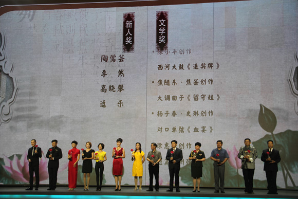 第七屆中國曲藝牡丹獎表演獎和理論獎的獲得者上臺領獎