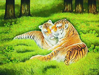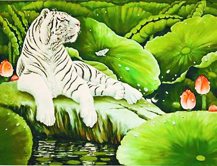 林柏良不僅表現自然界的老虎,而且將畫虎作為特定的藝術語言,來表達自己對現代社會的思考。他描繪母虎與幼虎之間溫馨慈愛的親情,意在喚起人們內心的愛和溫情,進而表達和平意愿,祈望人類友愛相處。他認為把老虎從野生環境中捕捉來關進籠子里任人擺弄,是對它們的摧殘,野生虎自然屬性的喪失正是現代文明過度膨脹的結果,他描繪這些喪失了自然野性本能的老虎,真正要表達的是對現代文明的質疑。不僅如此,在他看來,不但華爾街的股票交易像一群張著血盆大口的老虎在撲殺爭逐,而且在許多人心里也有一只貪欲的老虎。所以,他描繪一群沒有欲望、心情平靜的老虎,來提醒人類扼制物欲的膨脹。林柏良筆下的老虎,超越了前人對虎的簡單定義和既定形象,展現出畫家深厚的內涵和思考的深度。
