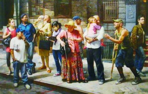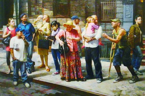 而最震撼我的,還是馬克斯·金斯伯格的三幅油畫:《公共汽車站》《皮耶塔戰爭》《無法贖回》,都是人物群像畫,只是將特定場景放入一種復雜的社會大背景里,融入更多的現實苦難和個人的慈悲感,通過群體人物的姿勢、動作和表情,表現畫家的時代責任感和人文關懷。《公共汽車站》,有看書的姑娘,有抽煙的男人,有抱著小孩的老漢,也有以不同姿勢站在那里等車的人,一位拄著拐杖的乞丐老漢,走過來伸手乞討,一位戴著草帽的老婦人從包里掏錢(給乞丐),更多的人只是無關自己地望著……這是今天社會最普通的一種場景,但它充滿著人性的關懷,充滿了畫家冷靜的慈悲感。《皮耶塔戰爭》,一個女人雙手抱扶著躺在地上的男人的頭,仰天嚎啕大哭——那男人是她的丈夫,頭上裹著滲血的紗巾,躺在地上,一只腿、一只手都已被炸掉……而他們的背后卻是戰爭滾滾的硝煙——畫家在呼喚和平,呼喚人道。還有好像是再現美國9·11事件現場目睹者表情的《無法贖回》,重現一種悲傷的記憶,喚醒人們對生命的珍惜,對大愛的追求及對慘無人道之惡行的譴責。