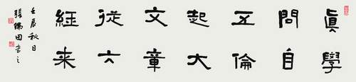 瑞田的字是典型的文人書法,是一種有學養、境界的“雅”字。他的書法不是以橫空出世的才華、氣韻取勝,而是以境界和秀美取勝。他的書法,尤其是隸書,有三大特點:一是方正內斂,與一般以扁取勝、以大幅度的昂頭翹尾取勝的隸書多有不同;二是他以典雅、古秀取勝,精致、秀氣、內勁外雅,有一種上層士大夫的高貴之氣;三是書法中含有金石味,那是他取法“毛公鼎”上的銘文、散氏盤等金屬鐘鼎器物上的金文所致。