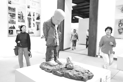 圖為雕塑作品《人與蛙》吸引了觀眾目光。 蔣新軍攝
