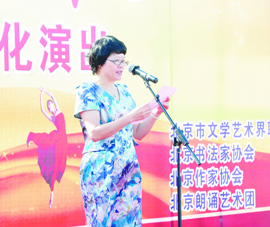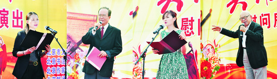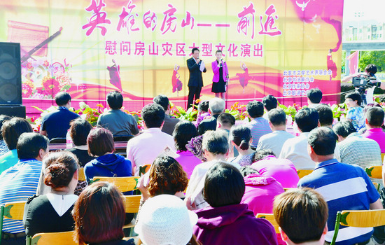 今年7月21日,北京遭受了六十一年一遇的特大雨災(zāi),尤其是房山區(qū)受災(zāi)嚴(yán)重。災(zāi)后,首都各界伸出援手,積極為房山群眾送溫暖、獻(xiàn)愛(ài)心。9月12日,北京市房山區(qū)閻村鎮(zhèn)文化廣場(chǎng)前人頭攢動(dòng),由北京市文聯(lián)、北京書(shū)協(xié)、北京作協(xié)以及北京朗誦藝術(shù)團(tuán)組織的主題為“英雄的房山——前進(jìn)”的慰問(wèn)活動(dòng)在這里舉行,這也是貫徹落實(shí)中共北京市委宣傳部深入開(kāi)展“走轉(zhuǎn)改”的又一次具體實(shí)踐。藝術(shù)家們?yōu)榉可绞転?zāi)群眾奉獻(xiàn)了一道精彩的文化大餐,著名書(shū)法家、演員40余人通過(guò)書(shū)法、歌曲、朗誦等形式表達(dá)愛(ài)心,演出由北京書(shū)協(xié)駐會(huì)副主席兼秘書(shū)長(zhǎng)田伯平與中國(guó)煤礦文工團(tuán)演員溫嘉勵(lì)共同主持。