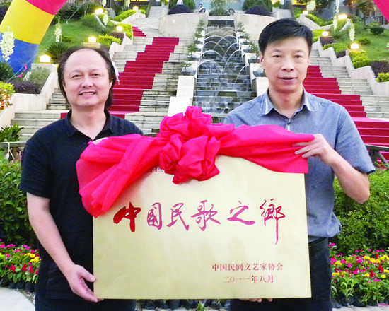 中國民協副主席吳元新(左一)授予六合區“中國民歌之鄉”稱號,六合區文廣局黨組書記李亞太接牌