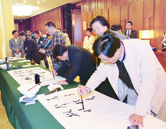 在書畫筆會上,作家兼書畫家們紛紛以書法的形式寫出自己贊美本溪楓葉的詩文,為此次公益文化行助力。