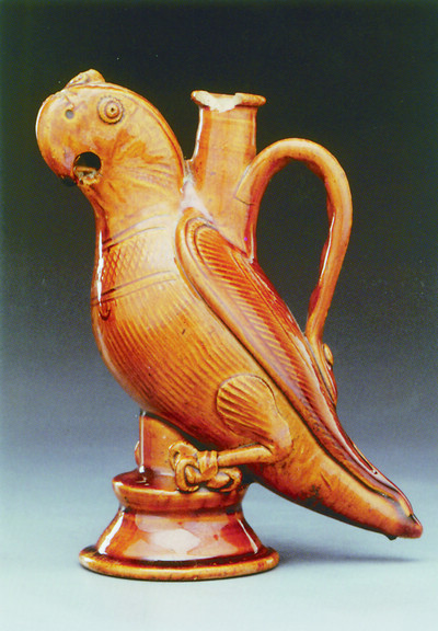 定窯瓷器典雅精致,具有高貴內斂的中和之美,以精美的刻花、印花白瓷最為著名,“紫定”、“黑定”等高檔顏色釉瓷和惟妙惟肖的象生瓷也被視為稀世珍寶。即日起至12月21日在北京藝術博物館舉辦的“中和之美——定窯陶瓷藝術展”,展出古代定窯瓷器190余件。圖中這件黃釉鸚鵡形壺便是展品之一,1969年7月26日出土于河北省定州市貢院內靜志寺塔基,胎白細膩,黃釉瑩潤光亮,采用雕塑和劃花技法,鸚鵡立于覆盆之上,頭頂飾流蘇,嘴作鉤狀與上揚的下顎對峙,中空呈卵形,舌尖平伸充其間,似作歌鳴狀,鼻孔如椒粒,眼作雙環肚臍狀,周邊壓印睫毛,通身陰刻羽翼紋,背部有注口及壺柄,底部有墨書“鸚鵡”二字。