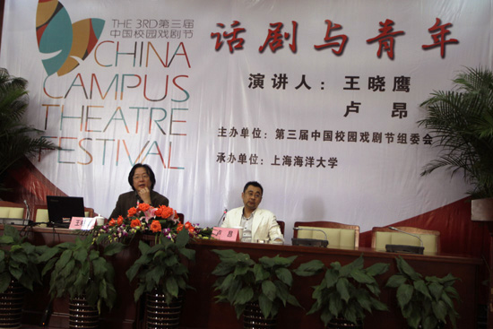 10月26日,第三屆中國校園戲劇節的第三場論壇在上海海洋大學舉辦,中國劇協副主席、國家話機院副院長王曉鷹和上海市劇協副主席、上海戲劇學院導演系主任盧昂為學生們帶來了一場主題為“話劇與青年”的論壇。 白偉 攝