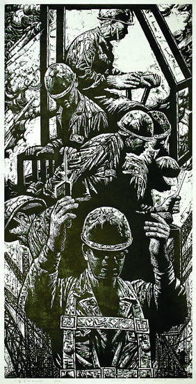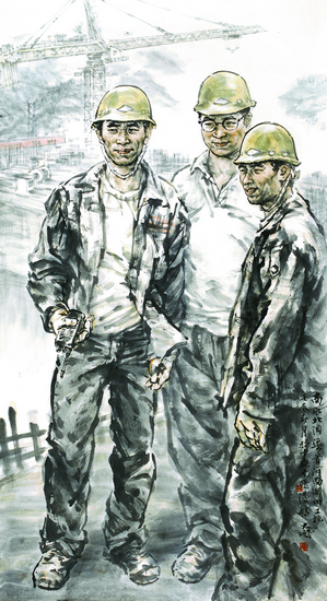 南水北調渠首的工人們(版畫)180cm×90cm 代大權