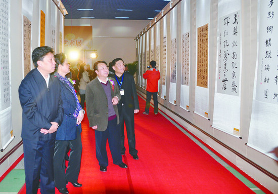 北京市文聯黨組副書記劉開陽,中共北京市委農工委宣傳處處長陳立璽,副處長李彬,中共北京市委農工委宣教中心副主任王輝,中國書協顧問、北京書協主席林岫,中國書協理事、北京書協駐會副主席兼秘書長田伯平,中國書協理事、北京書協副主席龍開勝、劉俊京、楊廣馨、孟繁禧,北京書協副主席胡濱,大興區政協副主席陳曉英,大興區文聯主席王青海,懷柔區文聯主席朱寶坤,大興區文化委員會主任王健,大興區文明辦主任張立群,大興區廣電中心主任李嶺濤,大興區委宣傳部副部長張凌,大興區新農村辦副主任劉強,大興區龐各莊鎮黨委書記王學軍,大興區龐各莊鎮鎮長賈衛國,大興區龐各莊鎮黨委副書記黃道平,宣傳部部長年宏偉等300余人參加展覽開幕式。林岫、陳曉英、劉開陽先后致開幕詞。開幕式由田伯平和中央數字電視書畫頻道主持人秦麗婷共同主持。