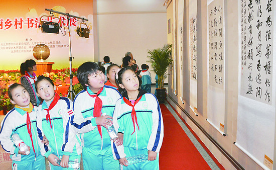 “美麗鄉村書法藝術展”已先后在昌平、通州舉辦,至今已是第三屆。藝術展旨在用書法藝術傳承和弘揚中華民族的優秀文化,促進和帶動遠郊區群眾文化活動的深入開展,立足京郊,放眼美麗鄉村,把書法藝術的種子播向廣袤的大地。參展作者均來自10個遠郊區縣,共有200余幅作品展出。這些作品表達了作者對家鄉故土的眷戀,觀眾在欣賞這些作品的同時,也能從中感受到現代農村經濟的騰飛,體會新農村人民精神文化的轉變。
