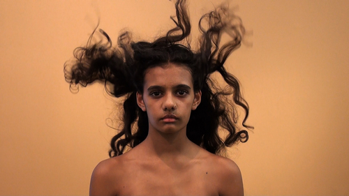 克里斯蒂安·湯普森的三頻錄像《炙熱》是一個非常美麗的作品。平靜的風(fēng)穿過女孩的頭發(fā),涼爽到令人昏昏欲睡,安詳?shù)拿娌勘砬闈B透出一種空靈感,將女孩描繪得宛如極端炙熱中一個引發(fā)幻覺的美景。