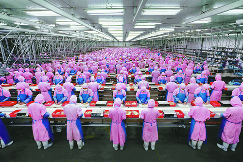 雞肉加工廠工人們等距離地站在他們所專注的裝滿雞塊的紅色托盤前,吉林,2005年