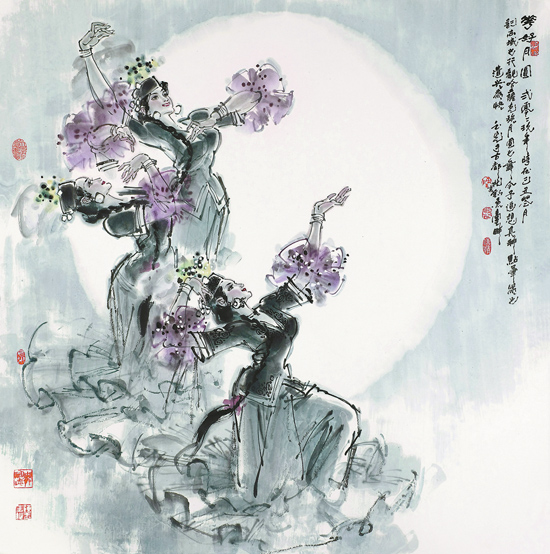 優秀畫家要有水墨創新的勇氣。中國繪畫藝術經過上千年積淀而博大精深。然而藝術貴在創新,作為當代中國畫家就應該“筆墨當隨時代”,具有扎實繪畫功力的陳玉先強烈意識到,要想在自己鐘愛的水墨舞蹈人物畫中彰顯自已的特色,就必須深入探索中國畫傳統藝術的特點,并吸收西方藝術的長處。關鍵在于:如何將生動優美的舞姿與中國畫的書寫性、韻律性以及東方所特有的情趣、神韻和意境相結合。畫家緊緊抓住“神情動態、筆墨意韻”,努力探尋結構造型、動態韻律、形神關系如何與中國畫傳統筆墨意韻的融合,力求不同舞蹈運用不同手法,線條剛柔虛實多變,墨韻潤澤靈動飽滿,結構光影并用,彩墨精妙艷逸。從而使作品激情飛揚,滿紙生風,將中國水墨畫的靈性和精要發揮得淋漓盡致。在這里,黃賓虹的積墨、破墨,張大千、劉海粟的彩墨,都沒有成為死板的教條,吞吐百家,推陳出新,藝術衍生了新的生命力。