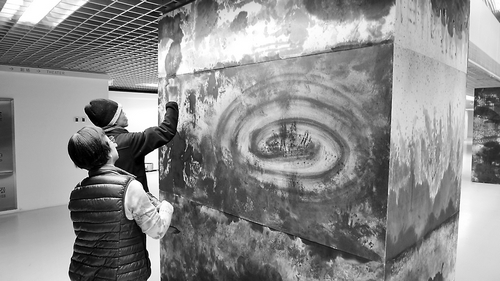 《天柱》以中國(guó)“天人合一”的哲學(xué)思想為基礎(chǔ),以“天柱”、“春”、“夏”、“秋”、“冬”及代表十二時(shí)辰與二十四節(jié)氣的17根梁柱為主體,以中國(guó)水墨精神為內(nèi)容,巧妙利用中華世紀(jì)壇當(dāng)代藝術(shù)館的內(nèi)部建筑結(jié)構(gòu),通過縝密的布局安排揣摩作品相互間的空間關(guān)系及觀者的視覺感受。它不僅從形式美學(xué)的角度提供人們對(duì)水墨媒材的視覺新體驗(yàn),更嘗試從形而上的藝術(shù)語(yǔ)言提供觀者對(duì)人與自然的關(guān)系的思考。主體“天柱”的動(dòng)態(tài)設(shè)計(jì),亦使得水墨藝術(shù)獨(dú)有的自由韻律與設(shè)計(jì)的理性邏輯在展示環(huán)境中并存且相融。