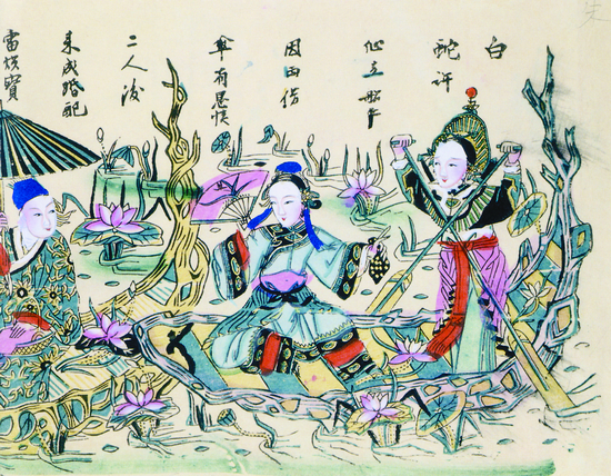 在“白蛇傳說”中,小青形象經歷了由最初的各種精靈鬼怪到明末馮夢龍擬話本的青魚精再到最終定型為青蛇精的變化。圖為根據白蛇故事創作的朱仙鎮年畫(局部)
