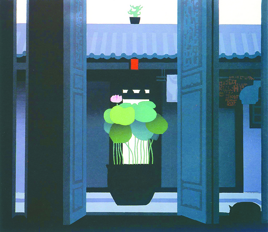 當然,嶺南文化的雅致也在“雅”部分有所體現。廣州西關一直是廣州極具代表性的地標性建筑,這一場景在楊蔭芳的《廣州西關》一作中得到重現,畫作仿佛把觀眾帶往1935年的西關小巷,在河涌上泛著小舟尋找往事,欣賞和回味那些已經被歷史淡忘的西關風情。肖映川的《潮汕農家》(1989年)則描繪了潮汕地區古典屋宅的場景:大門微啟,天井的大瓦缸養著荷花,屋檐下晾著暖色的衣服,整幅畫面用色單純,不同明度的藍色構成了畫面的主色調,傳達出異常寧靜的感覺,引起觀者的懷古之思。