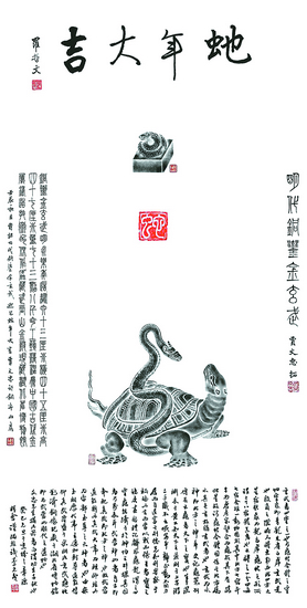 在農(nóng)歷蛇年來臨之際,青銅器鑒定專家賈文忠推出生肖青銅器全形拓新作《蛇年大吉》。