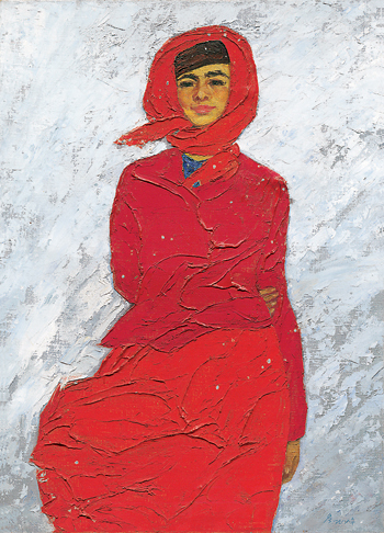 《高原的歌》創(chuàng)作于1979年,靈感來自先后兩次去四川阿壩地區(qū)體驗生活,雖然在那里的時間并不長,卻給他留下了難以忘懷的印象。在廣袤的草原上,有大片大片的花朵,人們騎在馬上,自然而然地唱起了歌,宛若天籟之音。那種恣意的歡樂,豪爽自在的幸福,連同高原清新的空氣,分外強烈的陽光,使他深深感動。以往關(guān)于藏族聚居區(qū)、藏族同胞生活的繪畫,主題大都是苦澀、凝重的,而在他的作品中,卻敢于用大片的紅色來涂抹。晚霞中騎坐在牦牛身上的藏族姑娘橫過草原,落日的余暉映襯著她逆光的身影,喜悅祥和。雪域高原不再凄冷,而是充滿了濃濃的暖意。如果說《高原的歌》是緊扣時代,給剛剛經(jīng)歷過“文革”的人們以精神上的慰藉;那么《回望》中的長城,則是他反思“文革”的全新載體。范迪安在《從象征寫實到抒情表現(xiàn)——對詹建俊油畫的再認識》一文中曾評價這幅作品:“烽燧似點,有古代畫論常謂‘高峰墜石’之重,城垣逶迤,如同古代畫論所稱‘潺潺一線’之靈。”遼闊的視野中,萬里關(guān)山盡收眼底,在層層疊疊的紅褐色峰巒之上,灰白色的城垣凸顯出一種歷經(jīng)世事的滄桑與壯闊,仿若撥動一根琴弦,聲音低沉,卻發(fā)出悠久不息的回響。這份許多人感受過卻描述不清或未能捕捉到的長城之魂,被他在畫中恰如其分地表現(xiàn)了出來。