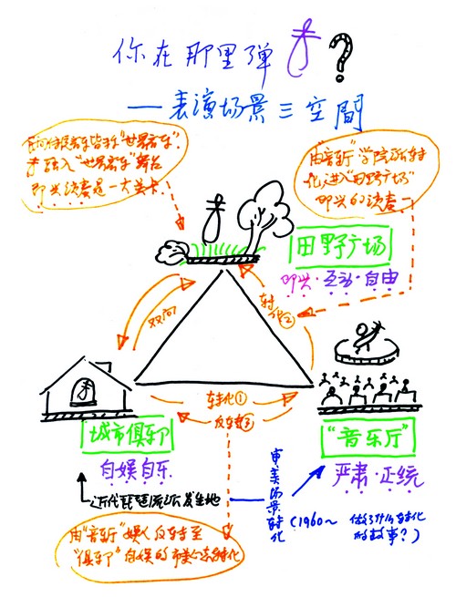 還有很重要的一點,我們每個音樂家都應(yīng)該自問我在哪里演奏?我們音樂家最習(xí)慣的一個空間就是音樂廳,其實我們有很多室內(nèi)民間器樂,比如古琴、琵琶,多在城市俱樂部、文人雅士聚集之地演奏,而民族管樂嗩吶等多在廣場。我們現(xiàn)在多是單一的音樂廳,其實對音樂本身來講就帶來極大的限制。我提倡表演場景的三個空間(參見本文插圖),也是希望審美場景的轉(zhuǎn)化,比如音樂廳是嚴(yán)肅正統(tǒng)的,以娛人為主,把觀眾作為上帝,老百姓喜歡什么我們演奏什么,去迎合,這一點始終是誤導(dǎo),老百姓也需要我們?nèi)ヒ龑?dǎo),現(xiàn)在也不提這個了。的確進(jìn)入音樂廳,更完整了,不粗糙了,往往自娛自樂的東西也沒有了。而城市俱樂部,其實是反轉(zhuǎn)為自娛自樂,我認(rèn)為這點對民族民間音樂十分重要,我在1960年前演奏多是在這種城市俱樂部,非常自由。而到了田野和廣場上,就是互動了,2010年我去日內(nèi)瓦演出,在音樂廳下午的正式演出后,晚上我與當(dāng)?shù)氐陌⒗畯棑軜返臉穾熞黄鹪趶V場上即興表演,現(xiàn)場很瘋狂啊。人的瘋狂其實是人的本性,是藝術(shù)的自由狀態(tài),“即興”自然而然就出來了。我認(rèn)為,演奏中“即興”是特別重要的狀態(tài),我也在培養(yǎng)學(xué)生這一點,東西全在譜子上,的確是規(guī)范的,但是離開譜子什么都抓不到,沒有那種即興、自由的鄉(xiāng)土味道。