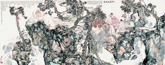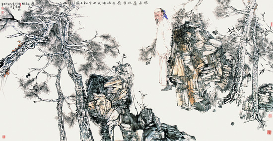 淼田先生的“林泉高士”系列,大致有兩種類型:一種是以大景山水為主、古意人物為輔,多為全景,表現(xiàn)“天地大美”的境界,應(yīng)合“天人合一”的精神;另一種是以人物為主、山石花樹為輔,多以近景,立足于由詩性的內(nèi)容美轉(zhuǎn)化為詩性的形式美的探求。前者多為縝密精致、積健為雄的大作,后者多為率意而為、筆隨心轉(zhuǎn)的小品。前者真情內(nèi)蘊,大美不言,后者抱骨藏精,形簡神完。偏愛“林泉高士”系列中以大景山水襯托古意人物的大作,那種全景山水的雄奇蒼辣、鐘靈毓秀,都不乏開闊的空間、層疊的峰巒、巖壑的起伏、古松的奇?zhèn)ァ⒃菩械难讣病⑵偎那郏瑹o不透露出樸茂高華的氣格。遠觀的古意人物處于這天高地闊、萬千氣象的山水之間,人與景匯,情與景融,山水因人物而清音,草木因人物而生情韻,無不蘊涵著“天地悠悠”的慨嘆。畫家憑借精于人物、工于山水之長,以一種在廣大空間的千丘萬壑中馳騁神思表達超越視界的審美感情,開發(fā)了山水畫精神表現(xiàn)的新領(lǐng)域,卓然而立于如今名家輩出的中國畫壇。