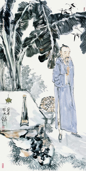 從王淼田“林泉高士”的寫意作品來看,他又是“傳統(tǒng)派”畫家。他以固守文人畫傳統(tǒng)的創(chuàng)作,改變了傳統(tǒng)文人畫在寫實主義思潮強烈沖擊下不斷萎縮和邊緣化的趨勢,使幾乎斷層的文人畫的水墨人物傳統(tǒng)得以延續(xù),“融古今以生新意”,滲透出有強烈現(xiàn)代感受的“新文人畫”的繪畫特征。