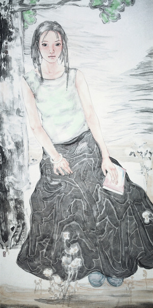 兩大派別或稱為體系的繪畫最直觀的區(qū)別在筆墨,體現(xiàn)在王淼田風(fēng)格迥異的兩大類作品中,則是“文人筆墨”與“非文人筆墨”之異同。他的“都市麗人”系列是以現(xiàn)實為依據(jù),以人物為中心。西畫的構(gòu)圖與造型方法幫助了他,使他在表現(xiàn)都市少女的手法上游刃有余,別開生面。但就筆墨表現(xiàn)而言,從寫實中脫穎而出的表現(xiàn)性的線、墨元素,特別是對線的運用,已不是傳統(tǒng)意義上線的用筆、組織與疏密關(guān)系,更多的是作為人物形體外輪廓的強調(diào),而墨的運用則是在為造型服務(wù)的基礎(chǔ)上,根據(jù)描繪對象的豐富和感悟的新穎,相應(yīng)地發(fā)展前人所無的筆墨。結(jié)構(gòu)處嚴以定位,非結(jié)構(gòu)處適當放松,有實寫、有虛寫、有夸張、有省略,力求以寫實為基礎(chǔ)參酌寫意,在新世界的探索中實現(xiàn)筆墨與造型的兼容,增強了畫面整體的表現(xiàn)力和感染力。他不是得自文人畫的筆墨工夫,而是得自悟性和對東西方繪畫的廣泛學(xué)養(yǎng)。