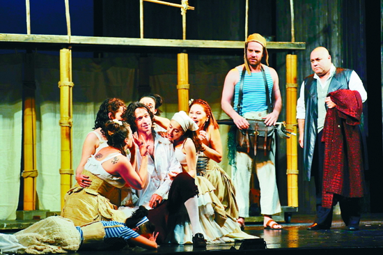 舞臺呈現上,我們又見到了熟悉的以色列式天馬行空的想象??少F的是,導演在構思上充滿想象力,始終服務于劇情的發展和人物的塑造。那替換了原著中馬車的自行車;飛舞在自行車前后、掛在竹竿上的海鳥;既能作為碼頭又能作為房屋、在舞臺上高速轉動的二層竹架;鄉婦們手中的白色長綢竟能化身波濤洶涌的大海,把唐璜和他的仆人淹沒其中。特別是當眾鄉民跳入“水”中營救唐璜主仆時,白綢蕩起,舞臺光影瞬間變成海底世界,演員們的動作也突然緩慢下來,猶如潛游于水下,全場觀眾為這樣精彩的演繹而熱烈鼓掌。