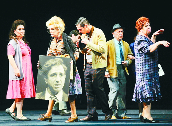 首先與京城觀眾見面的是《手提箱包裝工》(又譯《旅人》),首演于1983年,被認為是哈諾奇·列文早期喜劇的代表作,此次來京上演的是該團2011年的復排版本?;蛟S是出于對原版的敬意,復排導演烏迪·本·摩西在舞美上幾乎沿用了與原版同樣的布景道具及舞臺調度:空曠的舞臺,反復交叉的人群,可移動的小陽臺……相比《安魂曲》一望無垠、直通天際的斜坡,由演員扮演的充滿想象力的木屋、老樹、孤雁和瘦馬,充滿宗教元素吟詠的音樂,《手提箱包裝工》雖然也聚焦了小人物的平凡生活卻在舞臺呈現手法上略顯平淡。劇中共有20位演員參演,但群戲卻少之又少,只是在展現8場短促的葬禮時沿臺口呈剪影狀排列,其余均為2至4人的對手戲,且鮮有神來之筆。倒是貫穿全劇卻沒有一句臺詞的老祖母伯芭令人眼前一亮,她抱著沉重的行李箱、挪著小碎步、背著兒子從養老院逃回家的一幕幕,令人看后忍不住心酸。