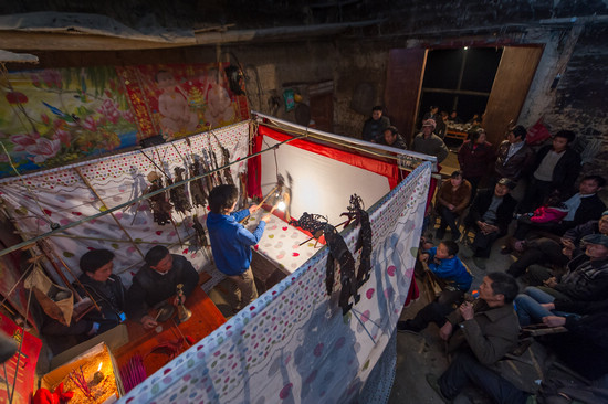 3月17日,巫山縣騾坪鎮觀奇村村民在觀看趙迎春(中)表演的皮影戲。