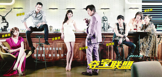 2013年1月15日,《奪寶聯盟》作為新年第一部分賬電影進軍中國。中國進口公司火山石影視通過中國電影集團在國內3000多家影院上映。如同《晚秋》擁有湯唯和玄彬這兩個有國際影響力的實力派演員,《奪寶聯盟》同樣使用韓港兩地的頂尖演員,可以說是影帝影后大集中。主要的香港演員有:香港金像獎影帝任達華,臺灣金馬獎、香港金像獎影后李心潔,實力演員曾國祥(曾志偉之子);韓國演員有:韓國大鐘獎影帝金允錫,韓國青龍獎影帝李政宰,韓國三屆青龍獎影后、一屆大鐘獎影后金惠秀,在韓國大鐘獎和青龍獎都曾獲得最佳女配角獎的“國民媽媽”金海淑,韓國大鐘獎影后“野蠻女友”全智賢,實力派演員吳達庶,韓國人氣偶像、電視百想藝術大賞最佳男演員金秀賢。擁有十位亞洲實力派演員加盟的《奪寶聯盟》,在故事架構和敘事編排上也頗具好萊塢巨制的氣勢。影片輾轉于韓國、香港和澳門三地拍攝,十位主要演員以群像的形式在電影中呈現,影片中的盜賊形象沒有臉譜化、模式化,而是個個身懷絕技,每個人都個性鮮明,立體飽滿。《奪寶聯盟》與之前廣受好評的《漢城大劫案》《老千》被視作導演崔東勛的“崔氏犯罪三部曲”。并且,這三部電影都是高智商犯罪電影的代表之作,集立意新穎、懸疑推理、華麗動作為一體。
