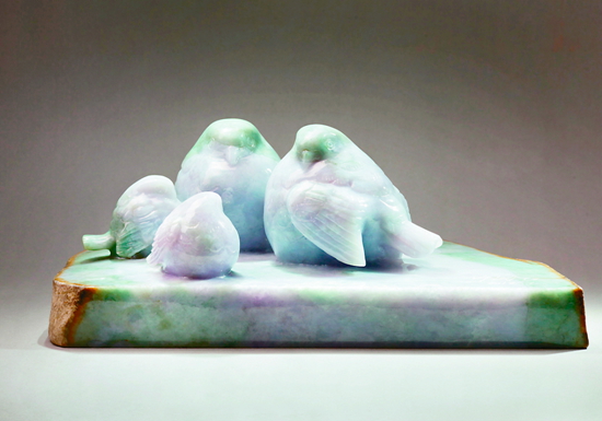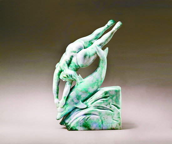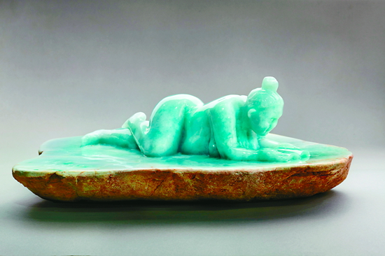 其四,材料拓展。2012年6月,許鴻飛在廣州舉行翡翠雕塑作品展,展示了30件以名貴翡翠材質制作的藝術品。他說,第一件翡翠雕塑很費勁,兩個月才弄出來。而最后的效果則讓許鴻飛大感意外——翡翠材質恰切還原了胖女人的珠圓玉潤,豐乳肥臀充盈著溫潤的光澤,材質成了雕塑語言的一部分,他的風格特色獲得進一步彰顯。而在展出現場,許鴻飛更聽取建議引入了“車模”理念,光艷照人的“藝術品模特”與《肥福》《肥二代》《四喜》等讓人開心的“翡女人”一同展示。許鴻飛以“翡翠雕塑第一人”再度成為媒體熱點,他不拘一格的藝術思維,也給人帶來新的啟示。