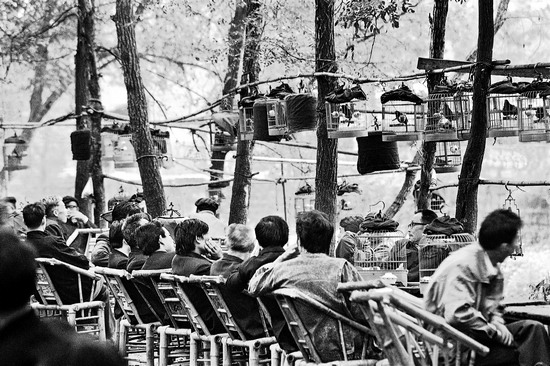 在四川,茶鋪是人們生活割舍不開的重要部分,茶鋪可以作為“客廳或休息室”,當然也可以派生出許許多多其它用場。比如民國時期,成都有些茶鋪就成為了行幫社團或袍哥組織的聚會之所,這類茶鋪又被稱作“行業茶鋪”。如“安樂寺茶館是糧油業的;下東大街的閑居茶館是紗布業的;上東大街的‘留芳’、城守東大街的‘掬春樓’、春熙南段的‘清和茶樓’是絲綢緞業的;安樂寺對面新商場茶社、春熙東段江樓茶社、大科甲巷‘觀瀾閣’是印刷業的;提督街‘魏家祠茶社’是皮鞋業的;商業場的‘品香’是槍支鴉片的交易市場;督院街口的茶館是全城武師會聚之處;還有的茶館是同鄉會、同學會的會址,像中山公園(今文化宮)的茶館內就掛著富順縣旅省同鄉會、屏山縣旅省同鄉會等幾十個會牌。”(《民國時期的老成都》王澤華、王鶴著)這一傳統延續至今,當你看見茶鋪門前懸掛的“XX川劇玩友協會”、“XX街道老年協會”或“XX信鴿協會”等牌子時便不會感覺奇怪了。再如成都新開街“蘭園茶社”,雖不完全是從事蘭草買賣的場所,因地處花鳥集市,茶社中匯聚著不少生意人,他們干脆將其作為了與買主周旋的“戰場”。賣花鳥的和買花鳥的,各自泡上一碗茶,理理性性地討價還價,做到休閑與買賣兩不誤。正是茶鋪這種特有的人性化氛圍,使生意少了一些商戰中的硝煙與殘酷,多了一點兒世故人情味。我還記得當時有一幫“鳥串串”(專以倒買倒賣鳥兒為業的人),為首的三十歲出頭,經常穿一件己經很陳舊的黑色皮夾克,帶領五六名二十歲左右的小跟班以“蘭園”為據點做畫眉、鸚鵡等生意。平日無事時,大家圍坐在茶桌前打撲克賭一些小錢混時間,見有買主來,“皮夾克”一遞眼色,跟班們便蜂擁而上,有的手上提鳥籠充作賣鳥人,有的假扮顧客在買主跟前爭著與賣鳥人講價,還有的裝作互不相識的圍觀者在一旁哄抬行市、推波助瀾,好似唱一出大戲,其目的當然是為了激將買主的興趣而促成生意,千方百計將買主口袋里的錢鼓搗出來。