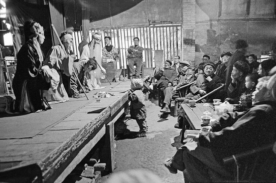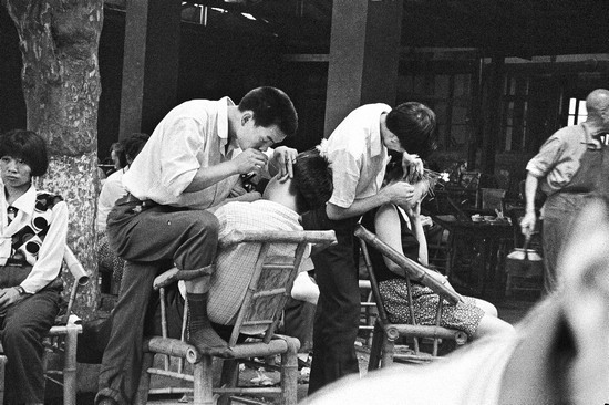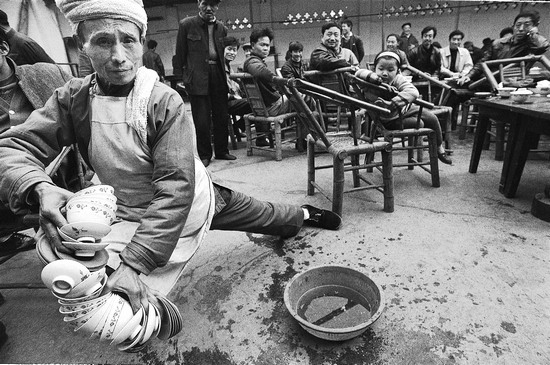 多年前回灌縣(今四川省的都江堰市)老家,跟隨素有坐茶鋪癮癖的幺外公喝過一次早茶。雄雞剛一打鳴,幺外公便喚醒了酣睡中的我,來到距家僅百米開外的一座臨街茶鋪。天色尚黑,街燈昏黃,行人稀疏,但茶鋪里卻已是沸沸揚揚——喊堂的,問早的,茶船茶蓋稀里嘩啦的,渾然一片,仿佛全城人一天的生活從這里熱熱鬧鬧開始了。茶客之間一陣例行的寒暄之后,幺外公揀了“亙古不變”屬于自己的椅子坐下來(老茶客都有了固定的座位),泡上蓋碗茶,在東方既白的清晨,他那一動不動的身影就像是一尊朦朧的雕像。幺外公向來少言寡語,常常會這樣靜靜地、心如止水般,在茶鋪里坐上一整天,有時甚至連飯都忘記回家吃。此刻,從他沉迷的眼神中,我分明感覺到平日間少有顯現、只有坐茶鋪才流露無遺的對現實人生極大的滿足。這次喝早茶的經歷讓我對茶鋪產生了濃厚的興趣,長時間地估摸著:是什么原因讓幺外公如此迷戀茶鋪?從那以后,茶館里的那種特有的氛圍也隨著茶香在我心中氤氳,我也有了幺外公般的迷戀,茶館和茶客們的百態也成了我鏡頭中的一個主題。