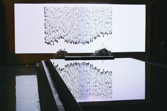 《智·結(jié)》是意大利藝術家魯?shù)希≧udy Pulcinelli)借由裝置藝術這種現(xiàn)代藝術形式對古老神秘的藏文化的一種意向化表達。這件作品的創(chuàng)作意向來自于藏文化中最具特色的3個文化載體——藏文、經(jīng)幡和瑪尼堆。藏文寓意冥想的符號,是與神靈和自然溝通的媒介;經(jīng)幡是福運升騰的象征,是文化的物化;白色的藏文符號一部分浮展于墻體上,一部分則延伸到地面,堆疊成瑪尼堆的造型。