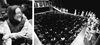 走進劇院,觀眾不免有些吃驚。劇院1500個座位保留了約一半,其余全部空置。原有的舞臺被改裝為觀眾席,正方形的環形舞臺圍繞著中央被稱作“蓮花池”的觀眾席。池中的座位可旋轉,觀眾一抬頭就能看到演員,并能隨時根據演出場景的變化調整觀看方向。在不少場景中,蓮花池甚至成為布景的一部分,演員也會從席中橫穿而過。遲到的觀眾趁著暗燈走進蓮花池,一不小心就入了戲。