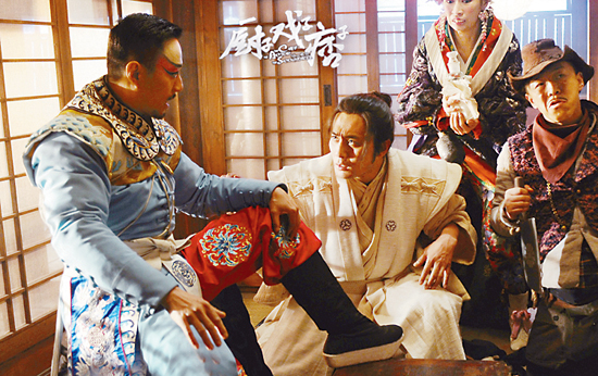 《廚子戲子痞子》定檔于“愚人節”,以戲謔荒誕的敘事風格掀開了三個男人的瘋狂整蠱戲中戲。影片以抗日戰爭為敘事背景,卻并未濃墨于敵人的大肆入侵或戰爭對百姓的迫害,而是通過發生在日本料理店里的一場荒誕、詼諧的鬧劇,以戲說的方式展開敘述,從而巧妙地規避了戰爭題材影片的刻板和循規蹈矩。影片開篇即上演了一段痞子攔路搶劫的戲碼,痞子誤打誤撞將兩個日本人劫到一家日本料理店,遇上了性格膽小的廚子和神神叨叨的戲子,一連串戲劇化的故事由此展開。這樣的開篇極易使觀眾以為這三個小人物陰差陽錯地與兩名日本生化專家糾纏不清,并沉浸在這群“混搭”人物之間的各種搞笑怪事之中,實則不然。影片隨即以倒敘的形式揭示了三位主角的真實身份,并交代了此次劫持并非偶然,而是經過精密設計,目的是為了截獲日本人救治“虎烈拉”瘟疫的疫苗配方,完成救國重任。此番劇情設置著實令觀眾大感意外,看似荒誕幽默的小故事背后卻藏匿著抗日救國的大計謀。隨后展開的敘事環環相扣,三位主角在嬉笑怒罵中驚險地獲取情報,緊張而搞笑。然而,相較于前半部分流暢完整的敘事,影片后半部分的起承轉合則看似凌亂無章,不免給人以隨意拼湊之感,且閃回的運用略顯刻意,合理性不夠。