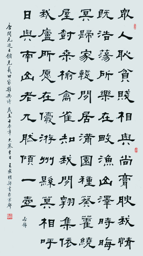 兩年前做過專題書法展的王明明,在繪事之余一直沒有停息對書法的研習,他深知書法于中國畫創作的重要性,認為書畫同源,線是畫之骨,如果書法不過關,線條必然立不起來,畫則癱軟無神。于是他臨碑讀帖,醉池數十載,其用筆勁厲、欹正互出,書風古意盈然、閑和平靜,一股撲面而來的文氣與靜氣,彰顯了其儒雅、練達、通透的境界與才情,于喧然鬧市中開辟了一片沉穩而又不失清靈的凈土。而其弟王衛明則被目為“入手就有意思”,童年時王衛明初習楷書,不到一年,偶試隸書,14歲就形成了自己的風格,一寫就是50余年,其遍臨《曹全碑》《禮器碑》《史晨碑》《乙瑛碑》《張遷碑》《華山廟碑》《石門頌》《西狹頌》《痤鶴銘》以及清代伊秉綬、近人王福庵等名帖墨跡,在創作中以漢隸為基,同時加入許多清人風貌。