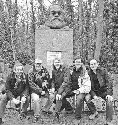 馬克思音樂劇創作者金策爾(中)和他的創作團隊在英國倫敦馬克思墓前合影。人民日報資料圖片