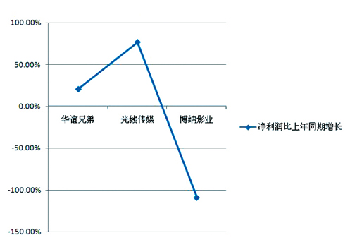 財報顯示,華誼兄弟實現營業收入138,640.16萬元,比上年同期增長55.36%;利潤總額為32,098.46萬元,比上年同期增長17.44%;凈利潤為24,442.65萬元,比上年同期增長20.47%。光線傳媒實現銷售收入103,385.53萬元,比上年同期增長48.13%;實現利潤總額39,242.21萬元,比上年同期增長82.61%;實現凈利潤31,021.99萬元,比上年同期增長76.47%。博納影業總收入達8.97億元人民幣,比去年同期8.01億元增長了12%,實現利潤總額為-158.57萬元,全年凈虧損達989萬元,與2011年相比下降111%,歸屬上市公司股東凈利潤為-809.63萬元,同比下降109%。