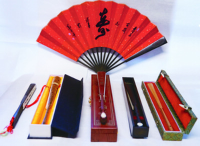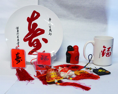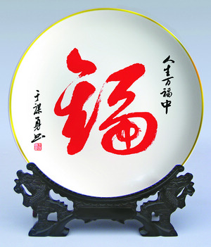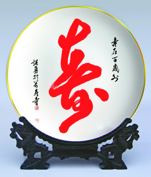 于謀勇福壽字一筆書被開發成藝術產品,從上至下分別為:“福”字瓷盤、“壽”字瓷盤、福壽瓶藝術品、福壽掛件藝術品、福壽扇面藝術品