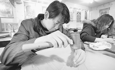 把皮革變成工藝品,并非易事,光是選擇原料就大有文章。皮面既要柔軟,又不能失去纖維韌性,且沒有絲毫傷痕。融合了繪畫、雕刻、染色、拋光、定形、半浮雕凹凸處理等藝術(shù)及工藝手法,再加上壓痕揉色、繪制定型到編縫起鼓、填充塑形等工序,粗略算來,一件皮畫需要經(jīng)過65道工序才能完成。