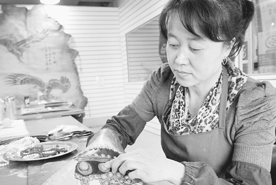 皮畫師閻粉魚為作品鑲嵌頭飾