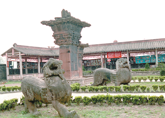 高頤闕主闕高6.13米,分闕頂、闕樓、闕身、闕座四部分,闕上有內容豐富的浮雕,闕前有一對“辟邪”石獸。新華社記者 陳燮 攝