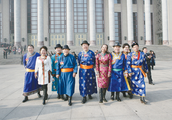 2011年,出席第九次全國文代會的內(nèi)蒙古文藝界代表走出人民大會堂