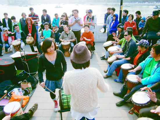每到周日下午,北京什剎海邊總是聚集著十幾位非洲鼓的愛好者,他們在一起擊鼓為樂,稱這個活動為“鼓聚”。“鼓聚”的組織者叫劉雍,幾年前接觸非洲鼓,從此喜歡,苦學苦練成了行家,在煙袋斜街開了一家鼓店,賣鼓也為普及非洲鼓樂。因此賣鼓的和買鼓的,教鼓的和學鼓的,漸漸在劉雍身邊聚成一個群體,“鼓聚”從此形成,一敲就是四年,成為每個周末什剎海邊十分搶眼的一道風景。常有中外游客經不住鼓聲的誘惑,沖進鼓圈實踐一把。劉雍每次也常備著幾只新鼓,不吝惜新人試手。“鼓聚”的參加者有年輕白領,也有臨時湊熱鬧的外地打工族,幾個骨干因此又建了一個“辛巴鼓樂隊”,經常會在不同場合,展示鼓技,奏響激情。在北京舉行的國際廣告節上,劉雍也帶著辛巴鼓樂隊登臺表演,一展“鼓風”。
