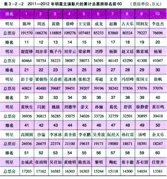 注:為了使排名更具客觀性,統(tǒng)計(jì)過程中嚴(yán)格區(qū)分領(lǐng)銜主演與主演,因而有部分明星雖然參演影片多,且參演影片的票房高,但排名仍相對(duì)靠后,如楊冪等。此外,若一部影片由多位明星領(lǐng)銜主演,則其影片的總票房同時(shí)計(jì)入到這幾位明星的票房統(tǒng)計(jì)當(dāng)中。因?yàn)樵摫斫y(tǒng)計(jì)樣本的年限為2011-2012年,所以表格所反映的情況有一定局限性,僅作參考。