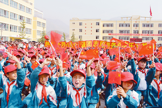 馬街小學的學生揮舞著小紅旗為藝術家們的精彩表演喝彩 本報記者 董大汗 攝