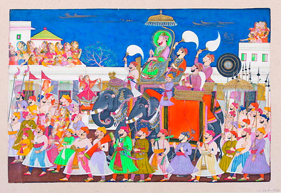 在這幅作品中,科塔大君拉姆·辛格二世(1828年至1866年在位)頭頂綠色的光輪,意氣風發地騎著裝扮華麗的大象在首府的街道上行進。拉姆·辛格二世是個傳奇人物,他喜歡通過繪畫作品來突出自己的權勢和活力,尤其是這種列隊行進的場景或者狩獵和戰爭場面。